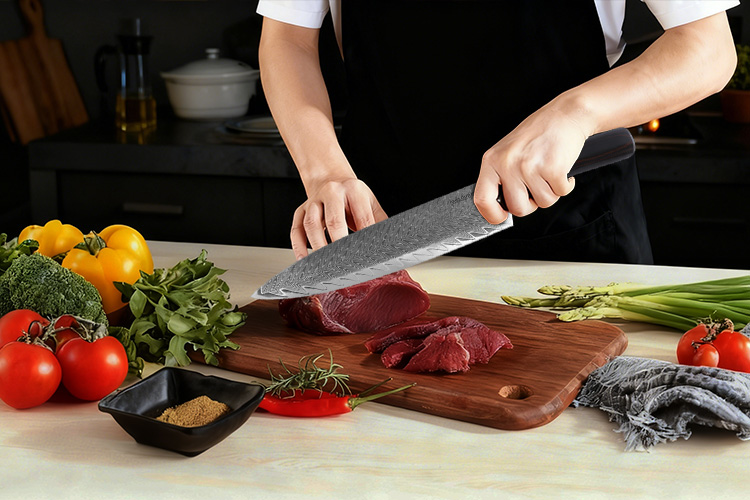 Jeder Koch braucht ein gutes Kochmesser! Unser beliebtes 8-Zoll Damaskusstahl-Kochmesser bietet herausragende Qualität: Die Klinge ist hart und langlebig, mit einzigartigen Wellenmustern, und die Schneide ist scharf und präzise. Es ist das "Allzweckmesser" in der Küche und eignet sich mühelos zum Schneiden von Gemüse und Hacken von Fleisch.